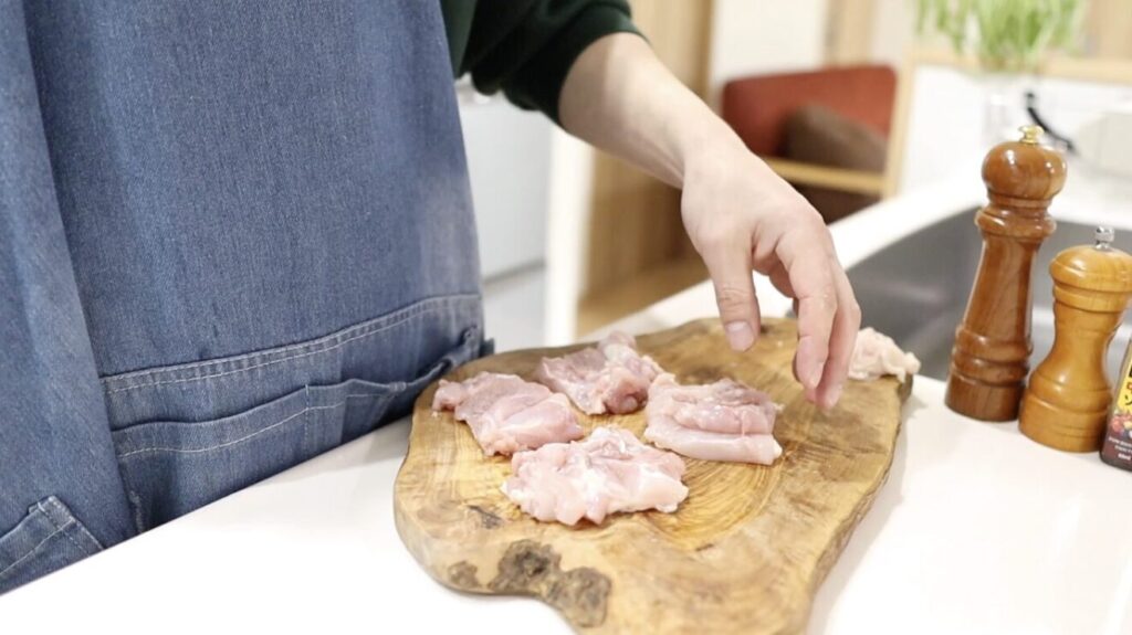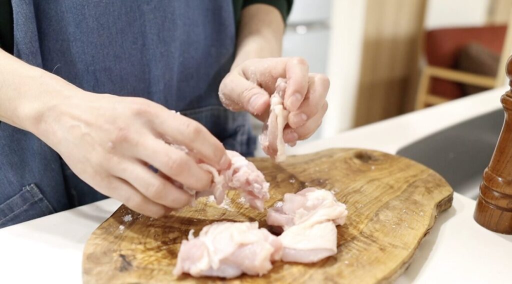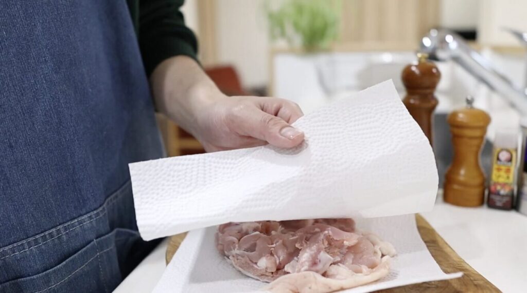 ①鶏もも肉の水分をキッチンペーパーでしっかり拭き取ります