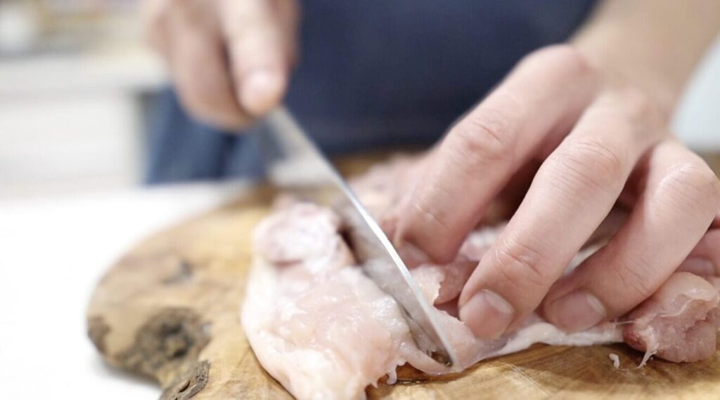②厚みのある部分に切れ目を入れます。包丁の先で全体を軽く刺します