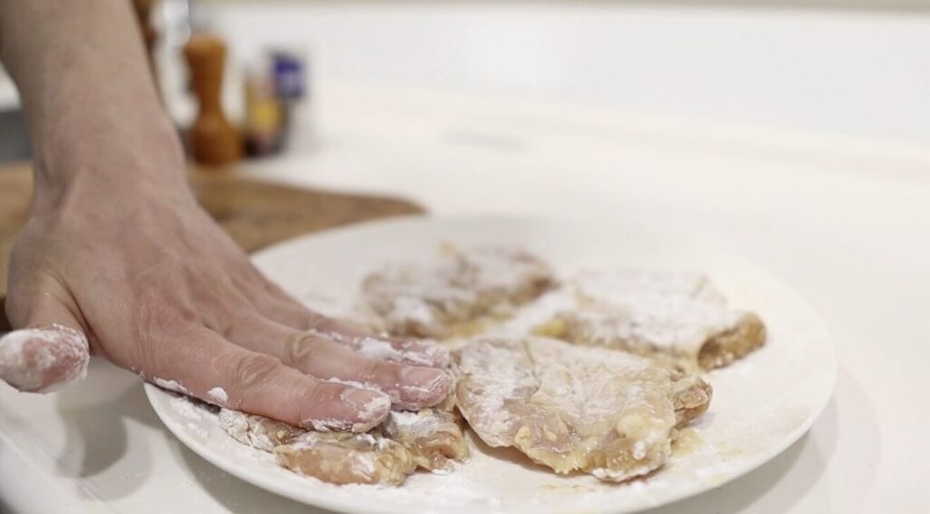 ⑦皿に片栗粉大さじ3を入れ、押し付けるように肉にしっかりつけます