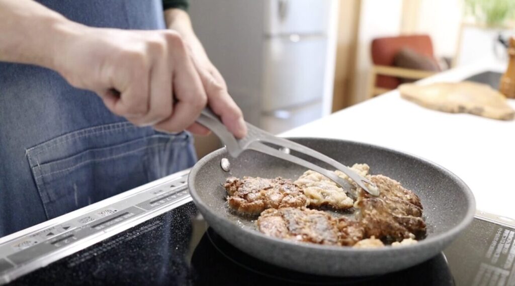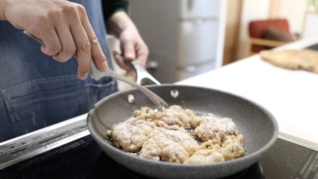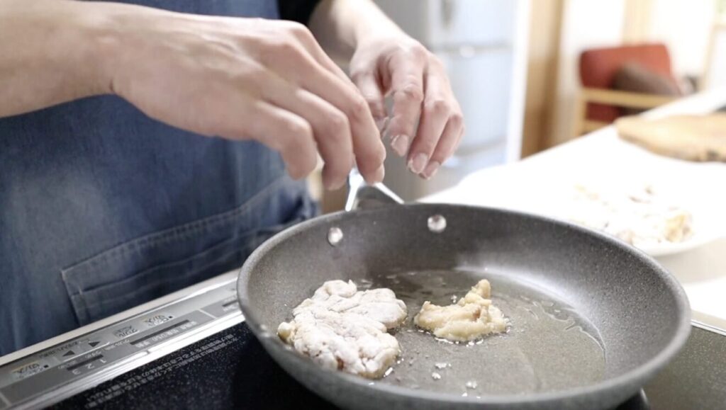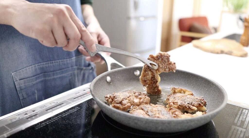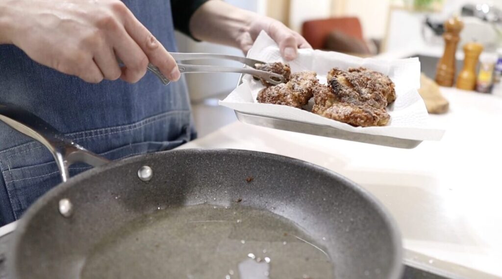 フライパンを使用し、少ない油でカリッカリに仕上げる作り方を紹介します