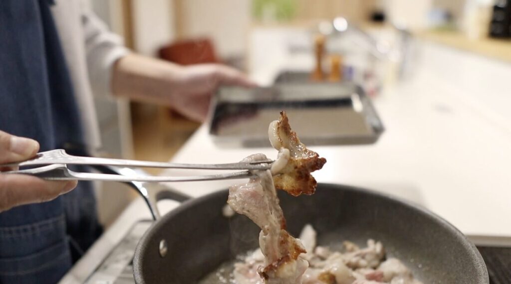 ⚪︎片面に焼き目をつけ香ばしさをだし、豚バラ肉の油を出します