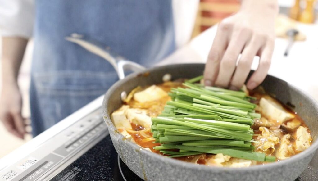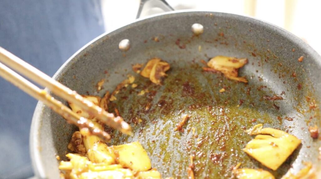 ④鍋肌に付くキムチの水分が少なくなったら一旦火を止めます