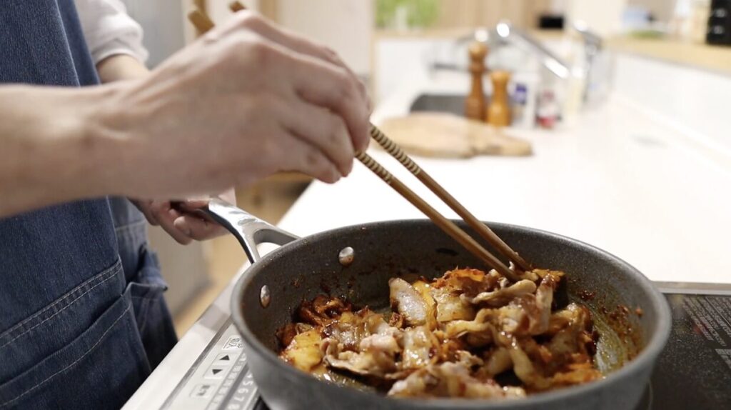 ⑤焼き目をつけた豚バラ肉を戻し入れ、キムチとよく混ぜ合わせます