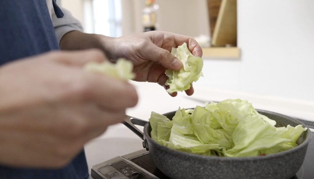 ⑥キャベツを手でちぎりフライパンに入れます。芯の部分はスライスし入れます
