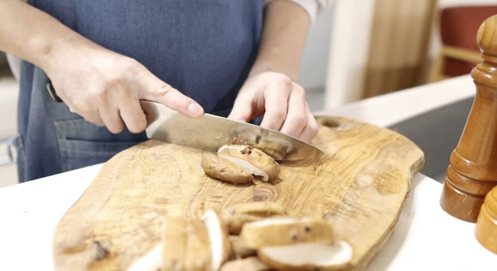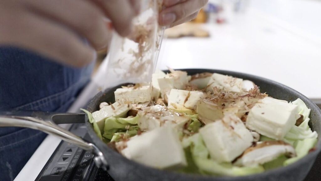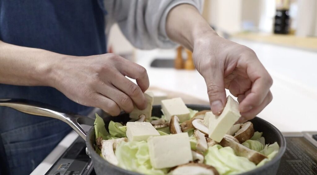 ⑦しいたけを太めにスライス、豆腐は水を切り好きな大きさにカットし、フライパンに入れます