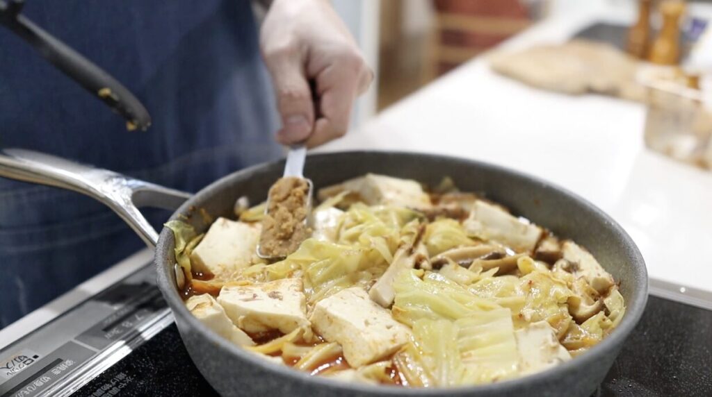 ⑩10分後、蓋をとり火を止め、残りの味噌大さじ1を入れ混ぜ合わせます