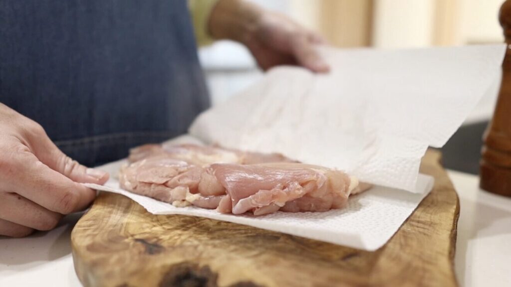 ①ペーパーでもも肉の表面の水分を拭き取ります。