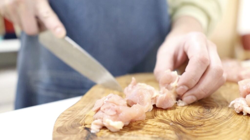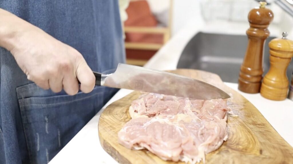 ②包丁の背(峰)で肉全体を叩き、一口大にカットします