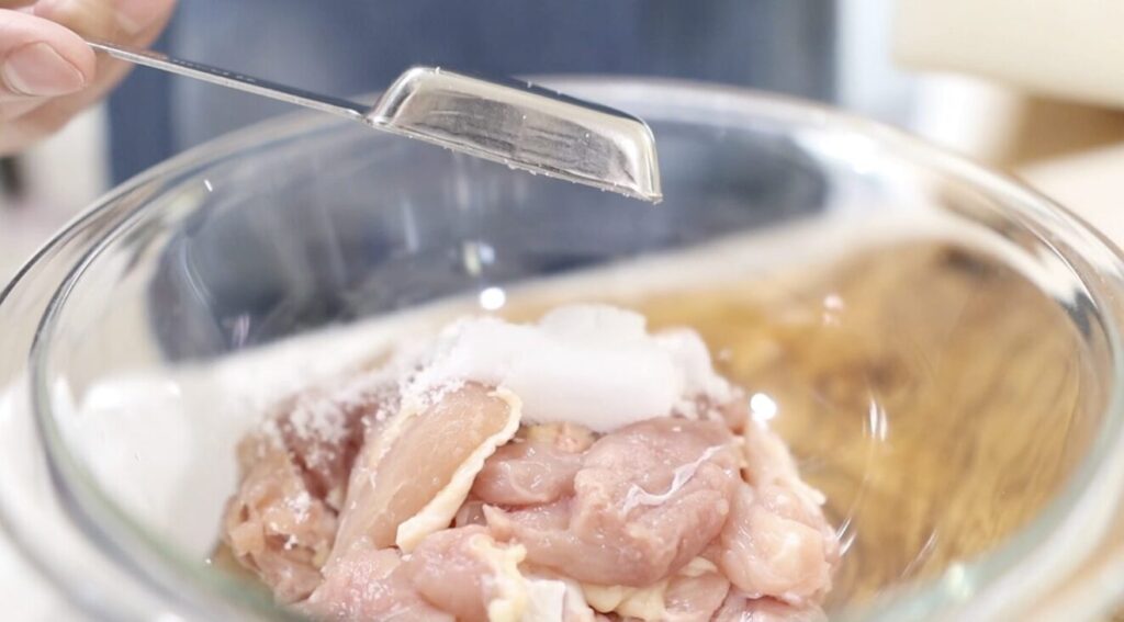 ⚪︎肉に砂糖を揉み込み保水性を高め、旨味の流出を抑えます