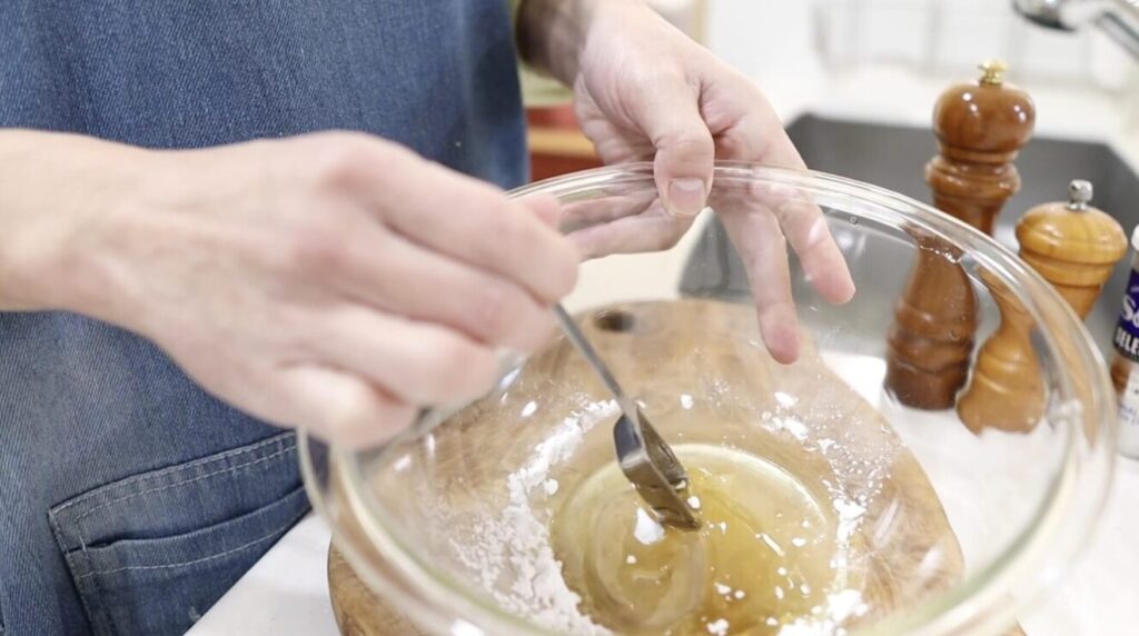 ⑥ボールに片栗粉とごま油を入れ混ぜ合わせます