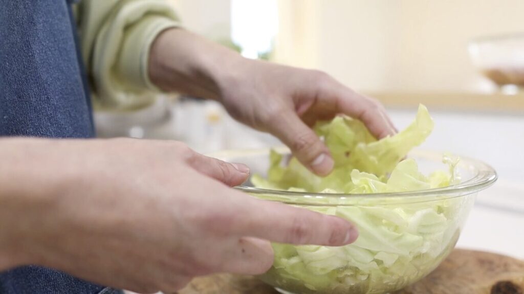 ⑦キャベツをボールに入れ、よく混ぜ合わせます