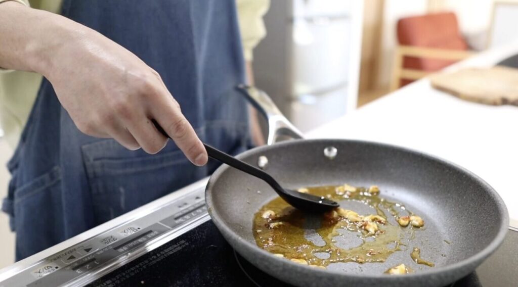 ⑧フライパンに油大さじ1(分量外)を入れみじんにしたニンニクと豆板醤を入れ中火にし炒めます