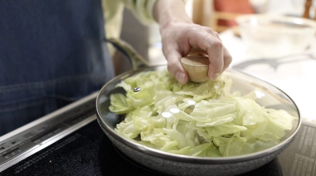 ⑩焼き色が付いたらひっくり返し、キャベツを入れ蓋をし2分蒸し焼きにします
