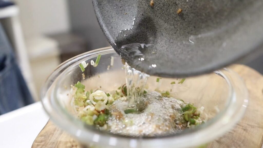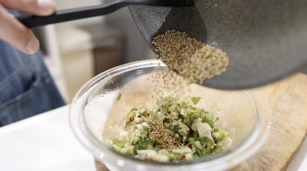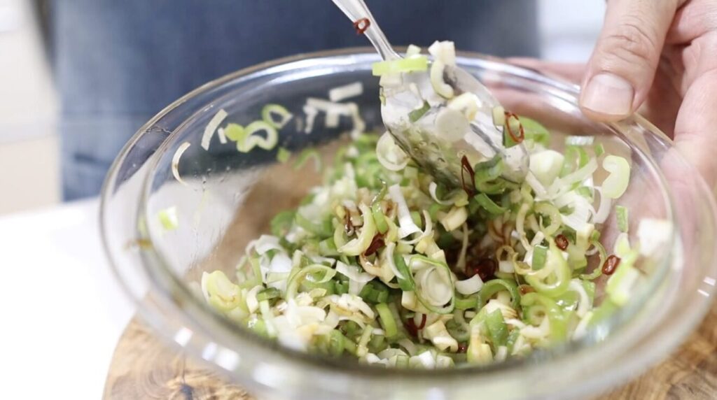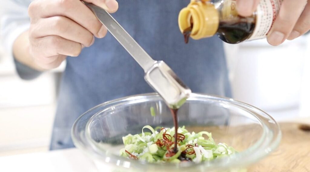④ボールに入った材料をしっかり混ぜ合わせネギ塩ダレの完成です