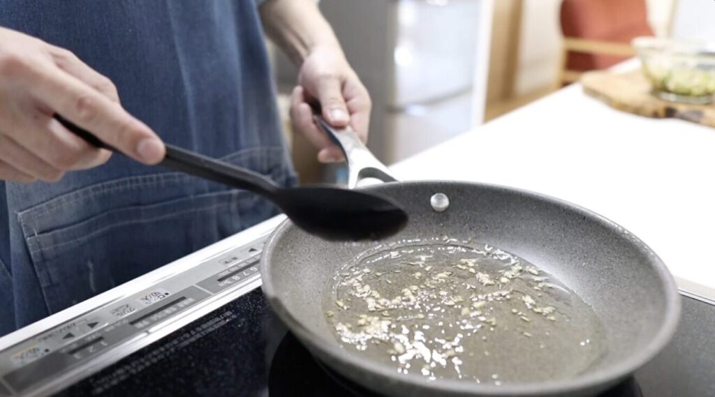 ③フライパンに油大さじ3を入れ、みじん切りにしたニンニクを入れ中火にかけます