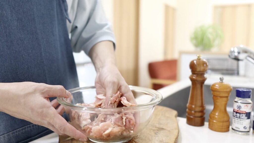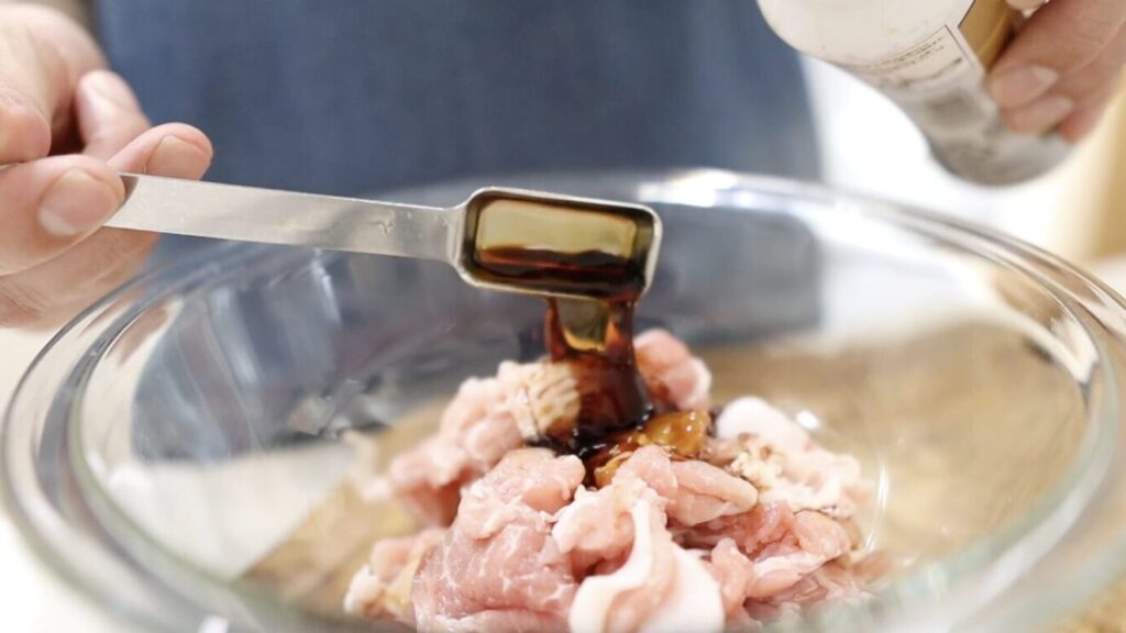 ⑤豚こま肉に醤油、酒、黒こしょうを入れよく混ぜ合わせたら、片栗粉を入れ混ぜ合わせます