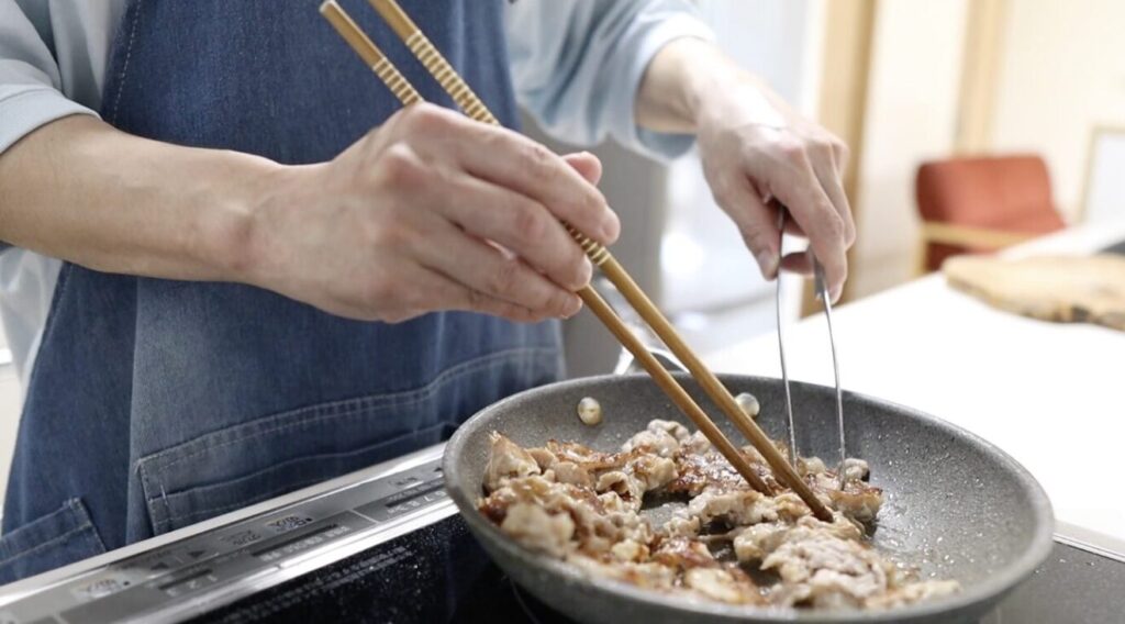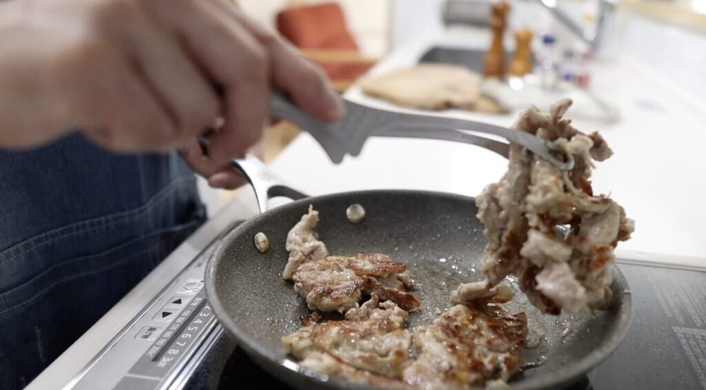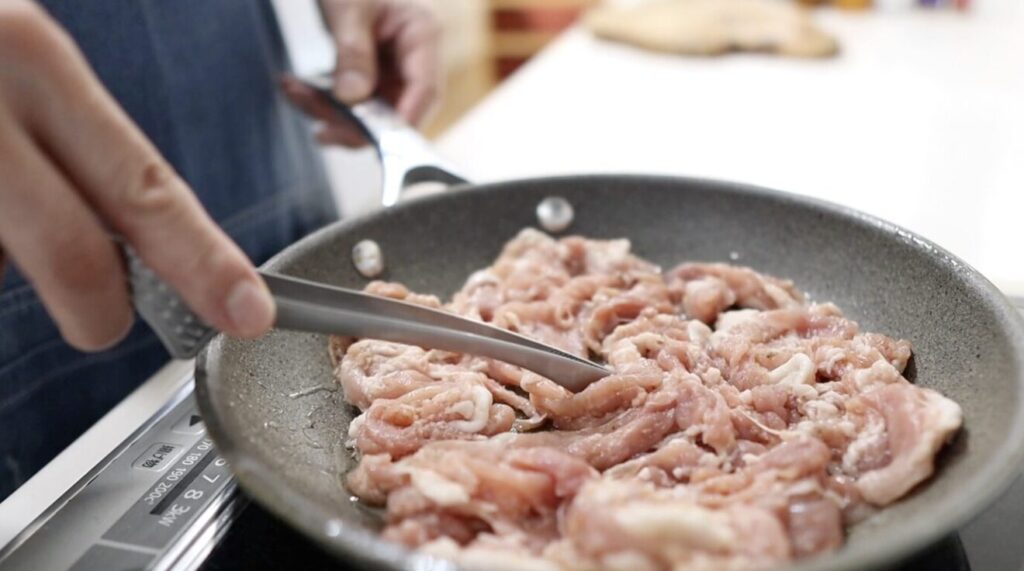 ⑥フライパンに油大さじ1(分量外)を入れ豚こま肉を均一に広げ、中火にかけます