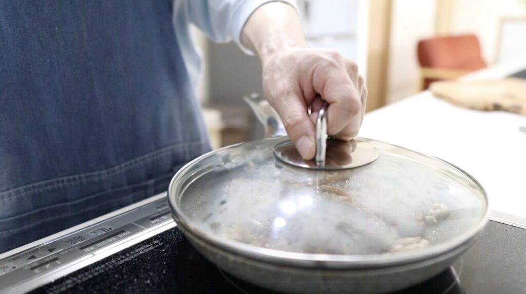 ⑧1分程経ったら蓋を取り、肉をしっかりほぐさずダマになっているくらいでOKです