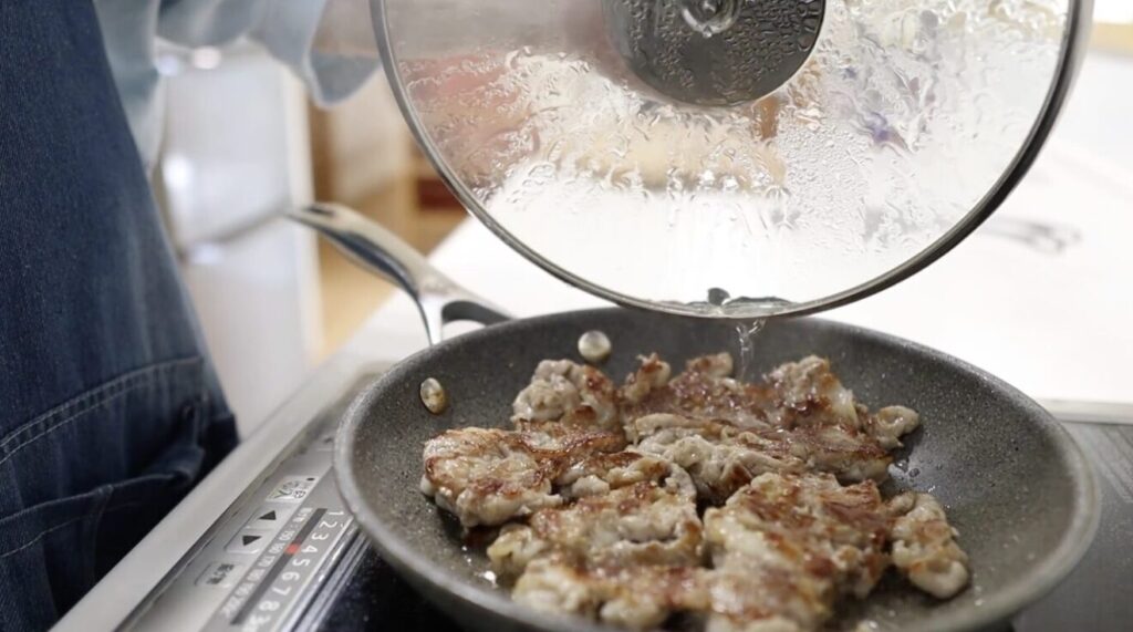 ⚪︎豚こま肉を焼き蒸しにし肉の水分を飛ばすことなくふっくら柔らかく仕上げることが出来ます