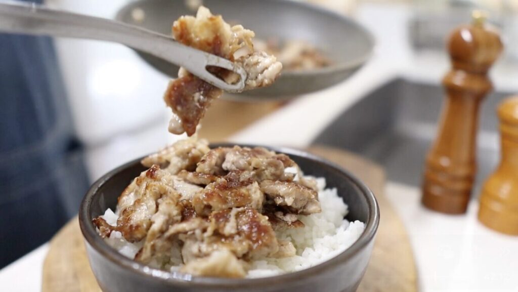 ⑨肉をご飯の上に盛り付け、ネギ塩ダレをかけたら完成です