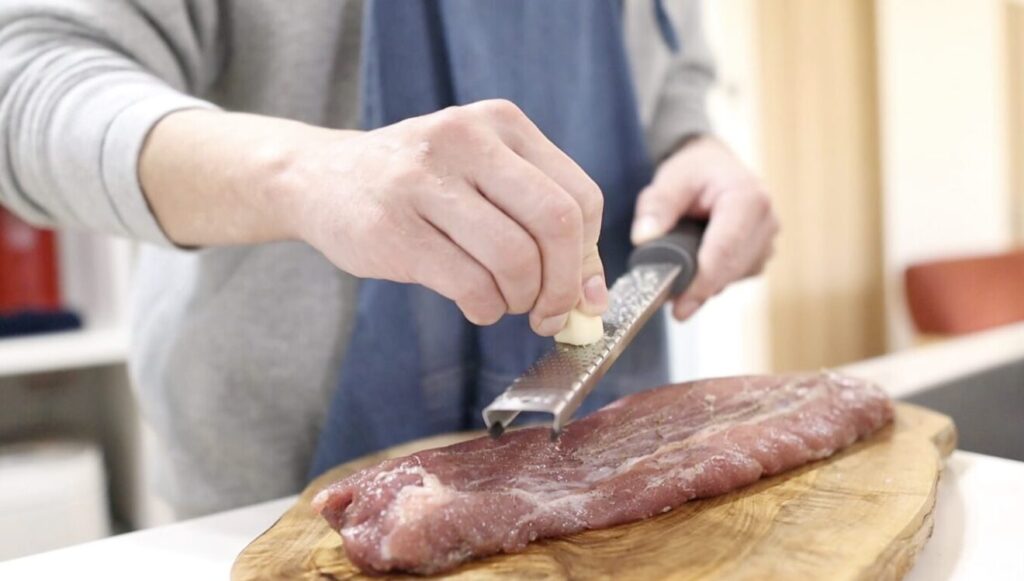 ②ニンニク1片をすり下ろし肉にすり込みます。長い場合は半分にカットします
