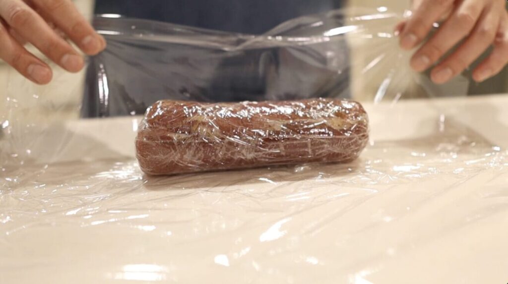 ③ラップを敷き空気が入らないように巻きます。漏れ防止にもう一度巻きます