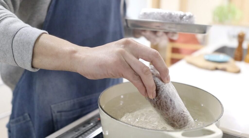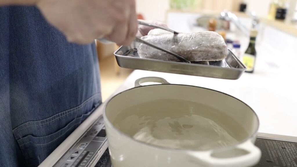 ⑤鍋にお湯を沸かし肉を入れます。再度沸騰したら火を止め皿を乗せて蓋をし30分置きます