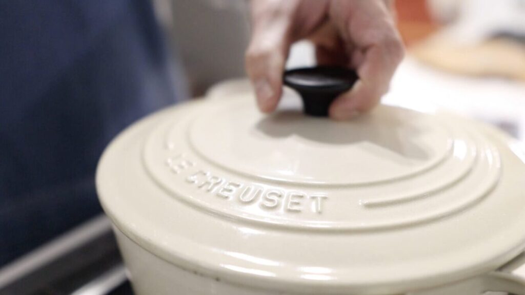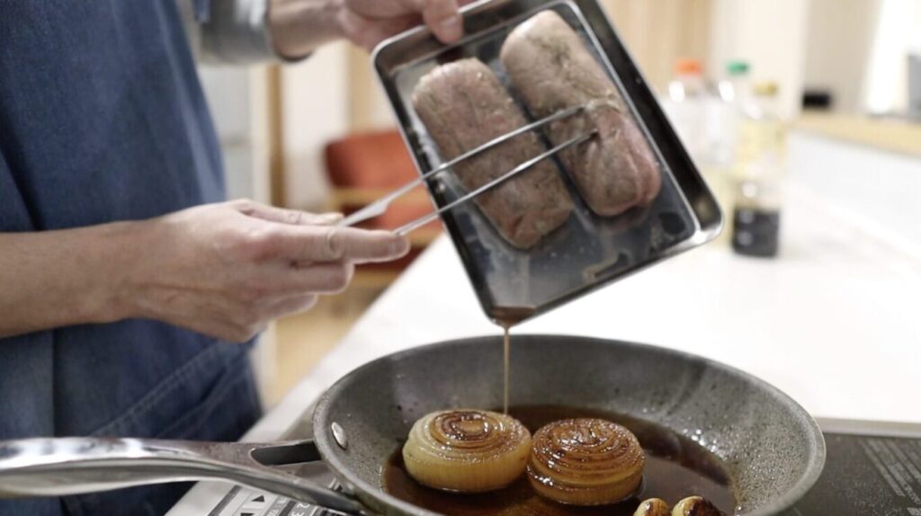 ⑨蓋を取り調味料と肉汁を入れ、中火で3分程煮詰め