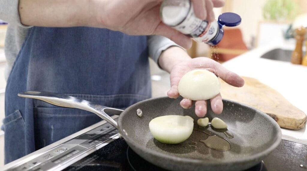 ⑦フライパンに油大さじ1(分量外)を入れ玉ねぎを半分にカット