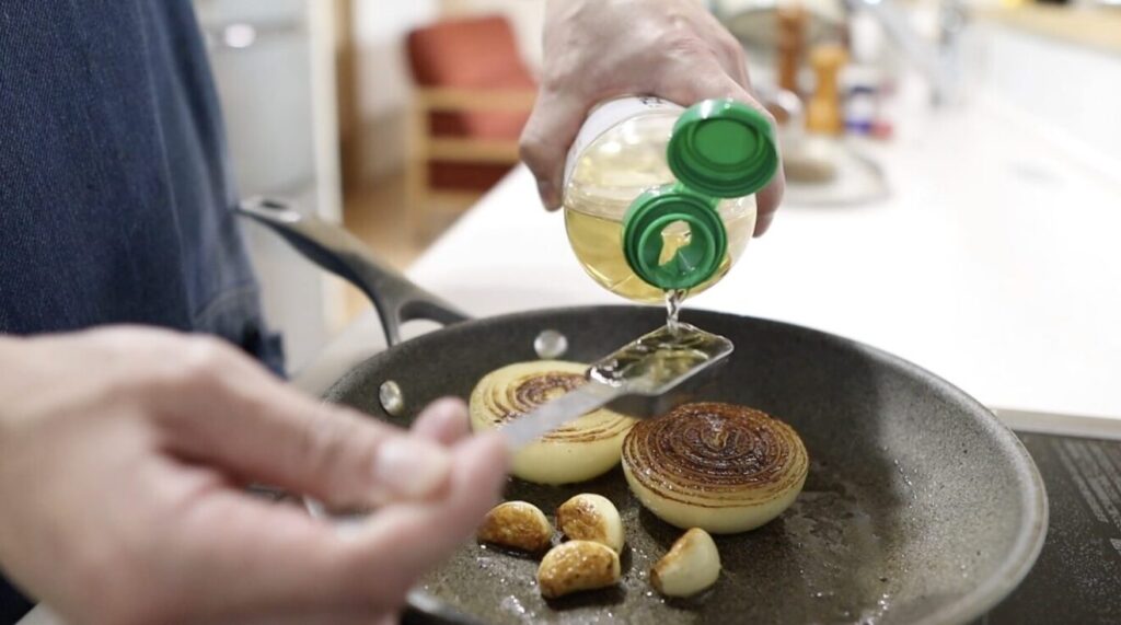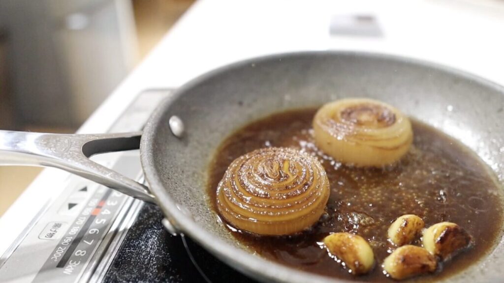 ⑧玉ねぎ、ニンニクに焼き色がついたらひっくり返し弱火にし