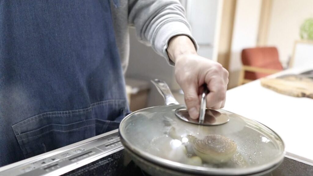酒大さじ1を入れ蓋をして15分蒸し焼きにします
