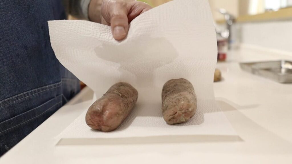 ⑪ペーパーで肉の表面の水分を拭き取ります