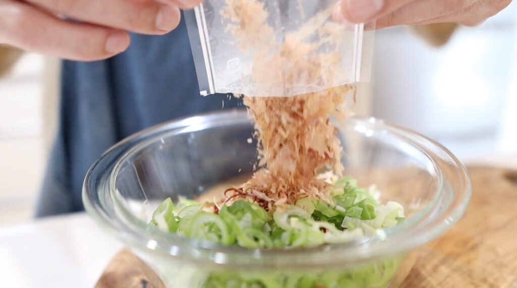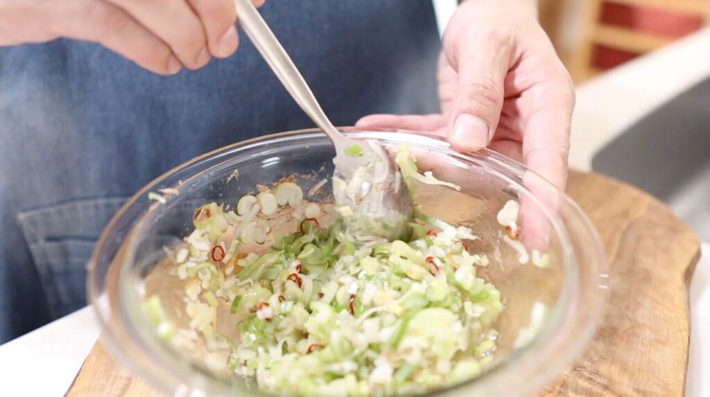 ①ボールにみじん切りにした長ネギ、生姜を入れ塩、酢、唐辛子、カツオ節を入れよく混ぜ合わせます