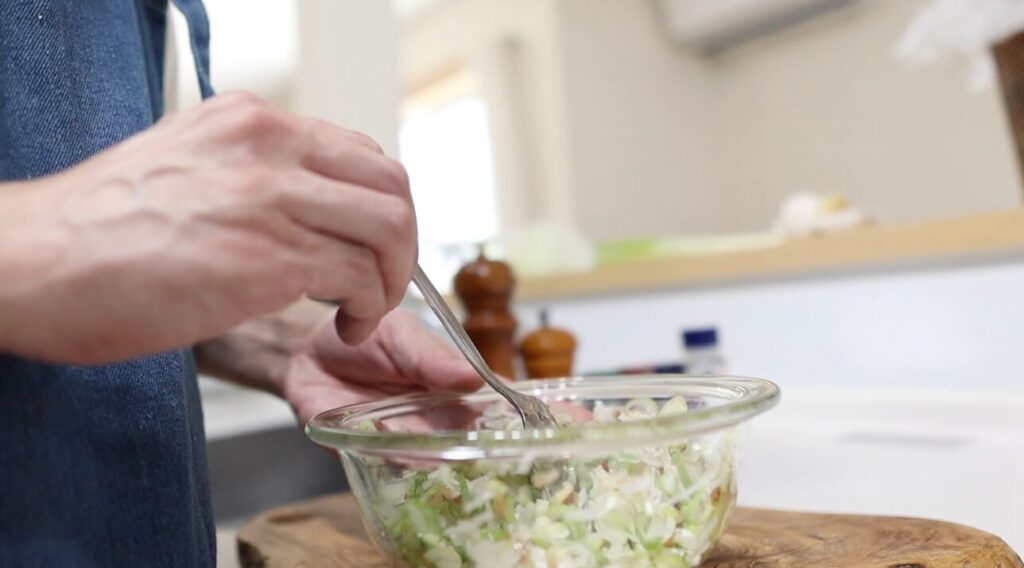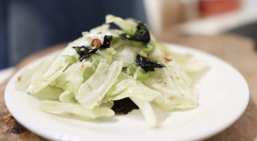 例:キャベツをちぎり、ネギ塩ダレを入れ、炒りごま、海苔を混ぜ合わせれば美味しくいただけます
