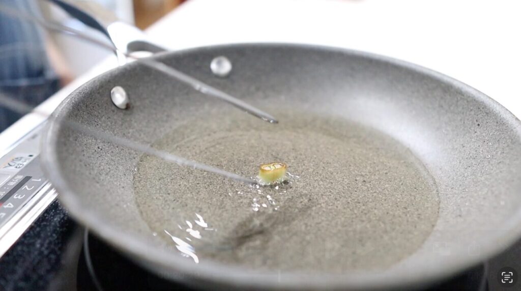 ②フライパンに油大さじ3とネギの切れ端を入れ中火にかけます
