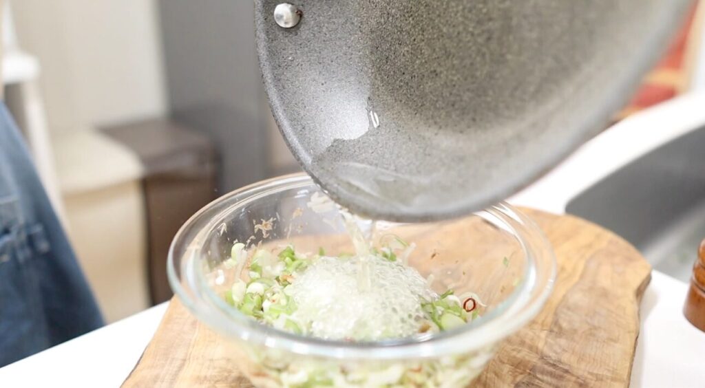 ネギがキツネ色になったら火を止めネギの入ったボールに流し込みます