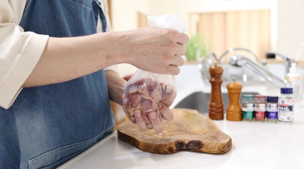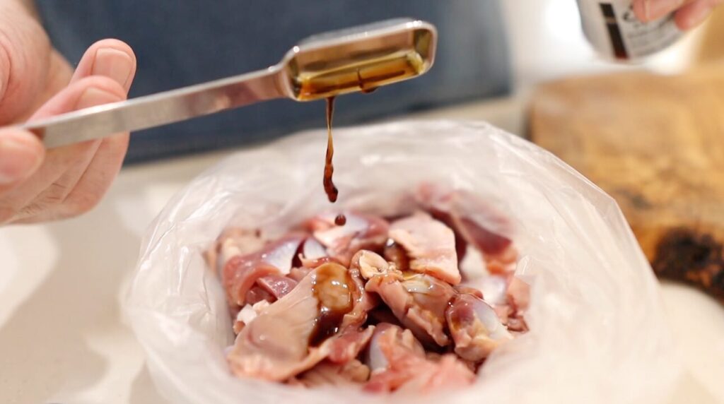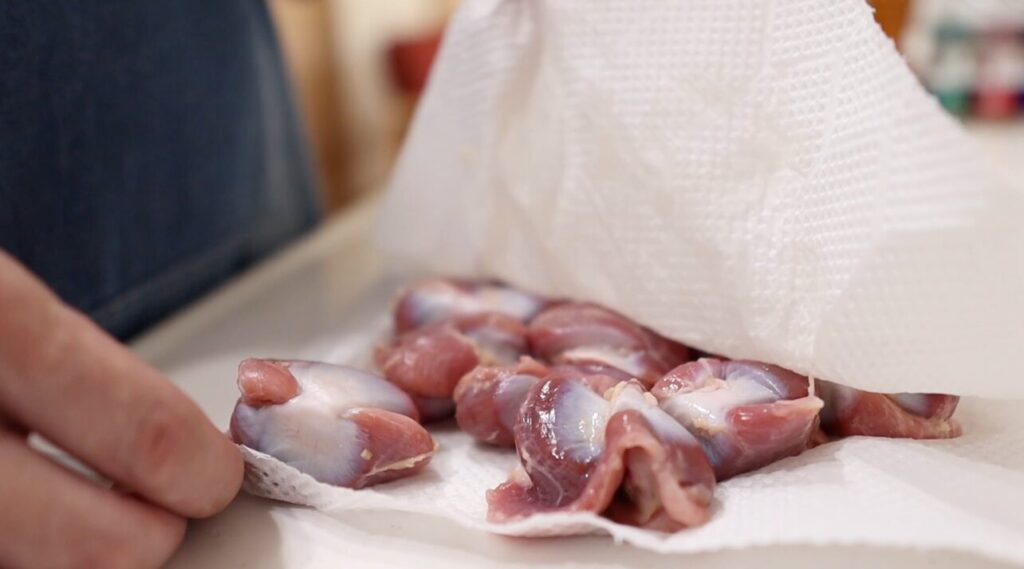 ④砂肝を流水で洗い表面の汚れを取り除き、キッチンペーパーで水分を拭き取ります※味が薄い場合は、塩を少々足し好みに調整してください