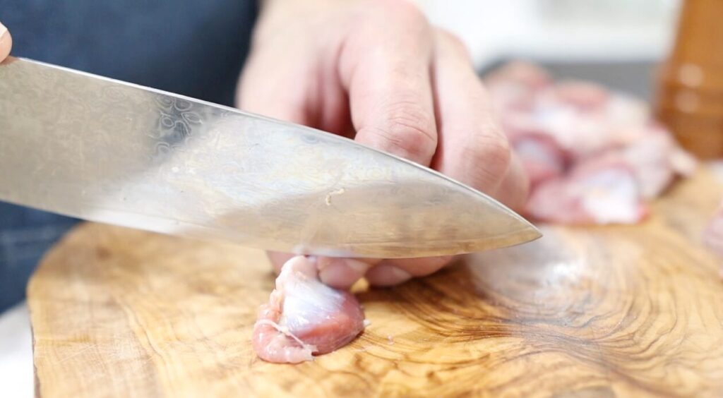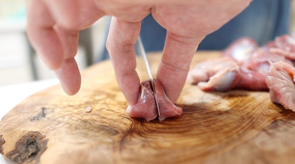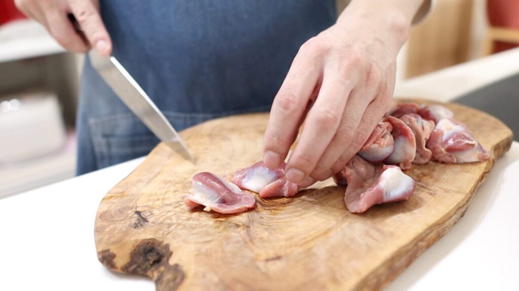⚪︎砂肝を半分にカットし銀皮の側面に切れ目を入れることで硬くならず食感よく食べられます