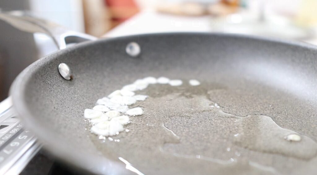 ⑦フライパンに大さじ1(分量外)の油を入れ、スライスしたニンニクを入れたら弱火にかけます
