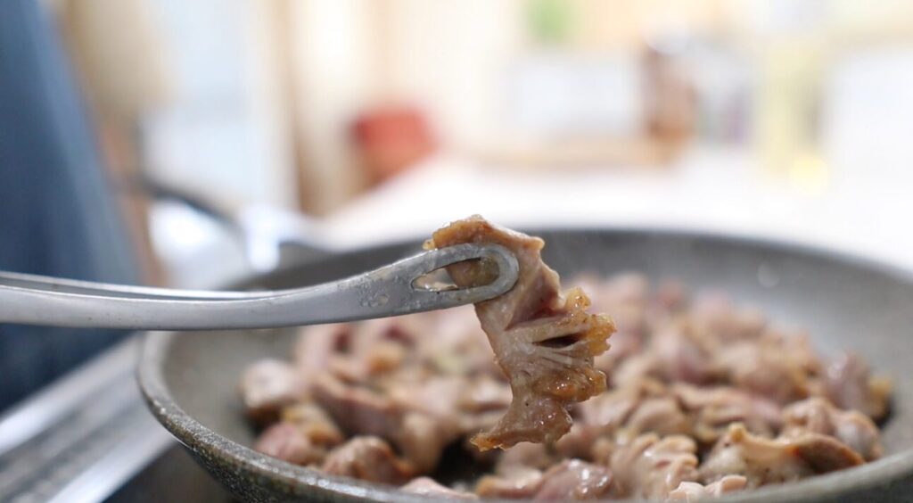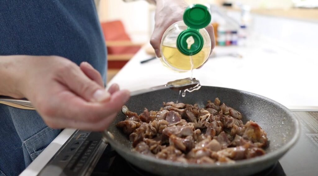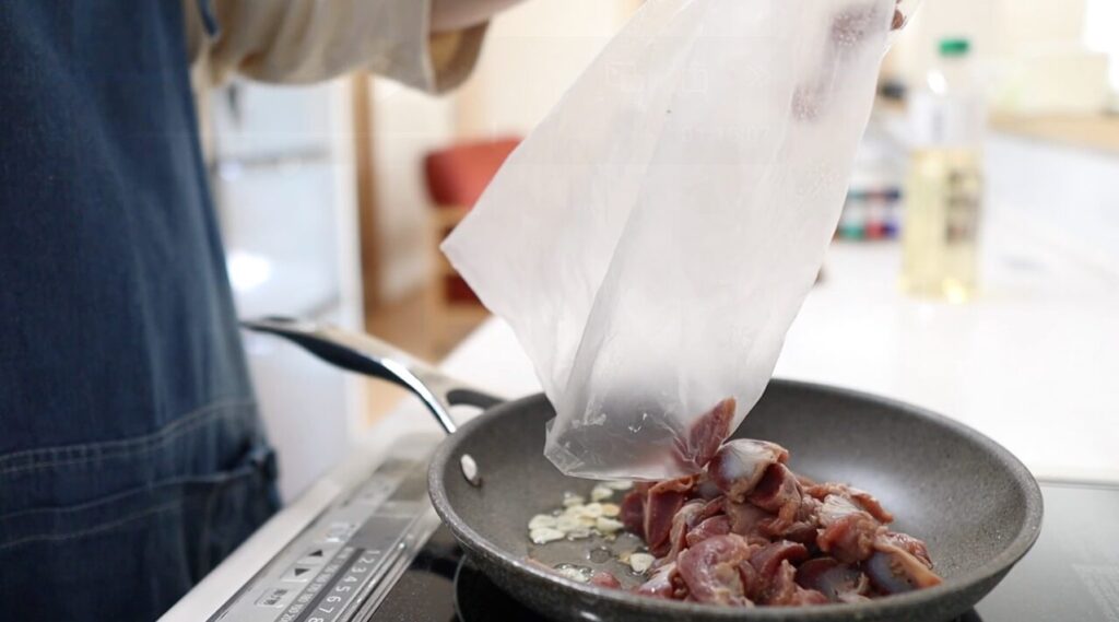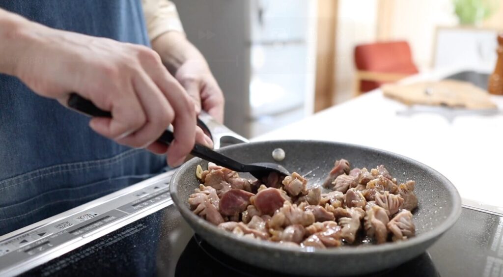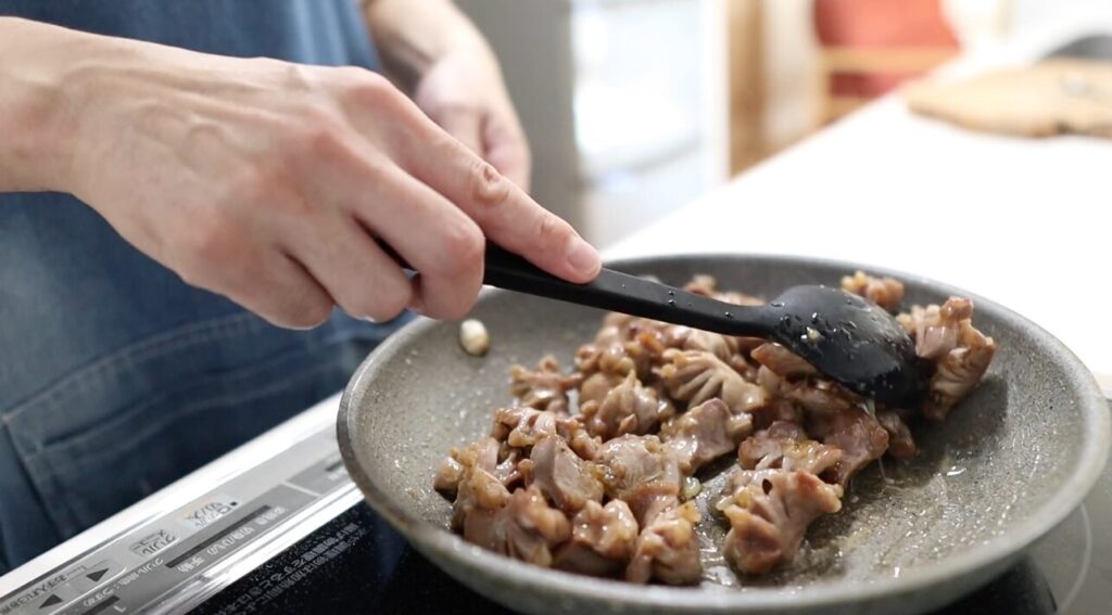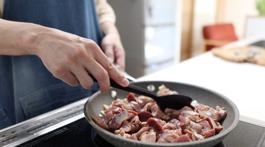 ⑧ニンニクが薄いキツネ色になったら砂肝を均一に入れ焼き色を付けていきます