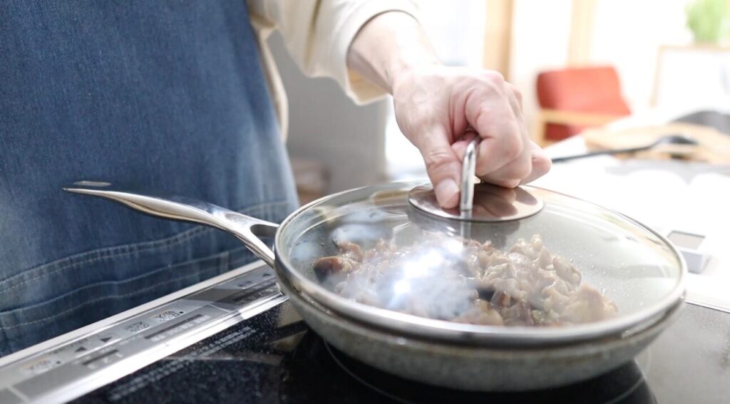 ⑨焼き色が付いたら軽く混ぜ合わせ、酒小さじ1(分量外)を入れ蓋をし、1分程蒸し焼きにします