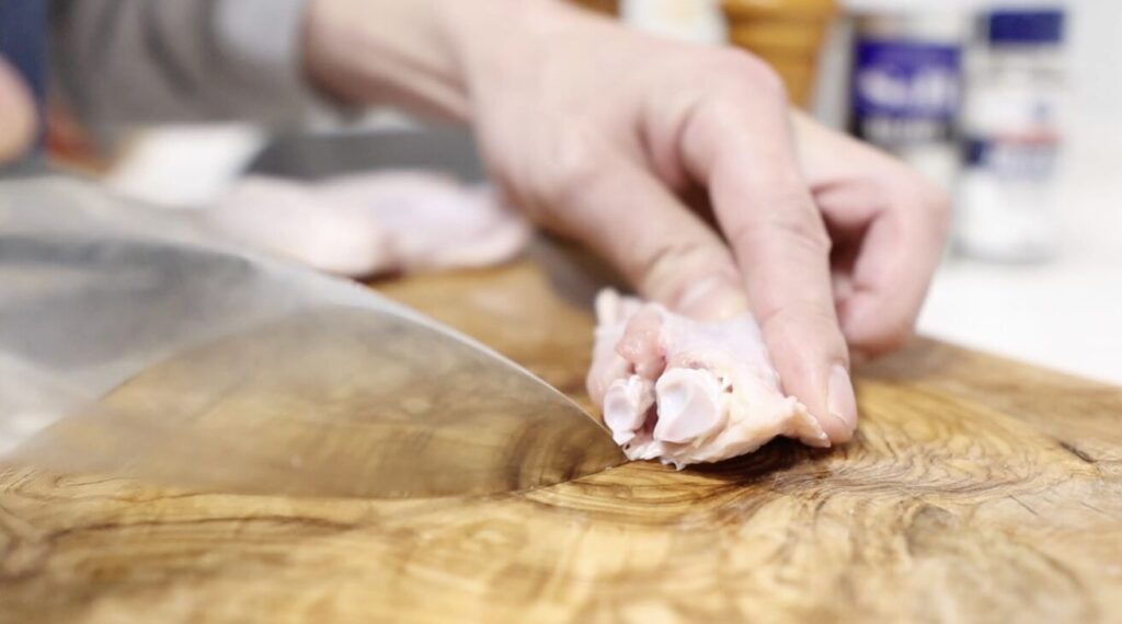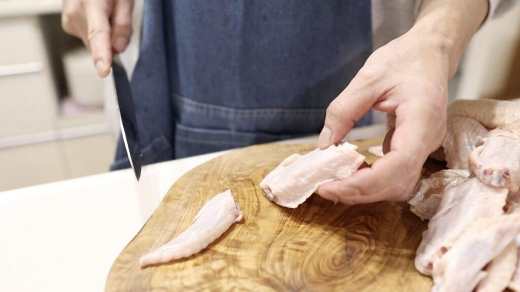 ②手羽先の関節に包丁を入れ先端部を切り離します