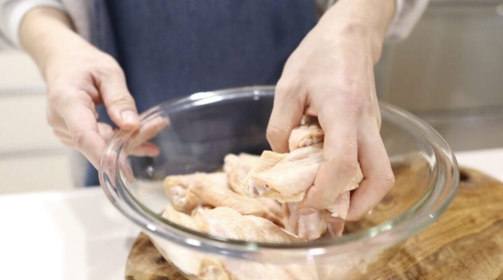 ④手羽先に醤油を絡め10分ほど置いておきます