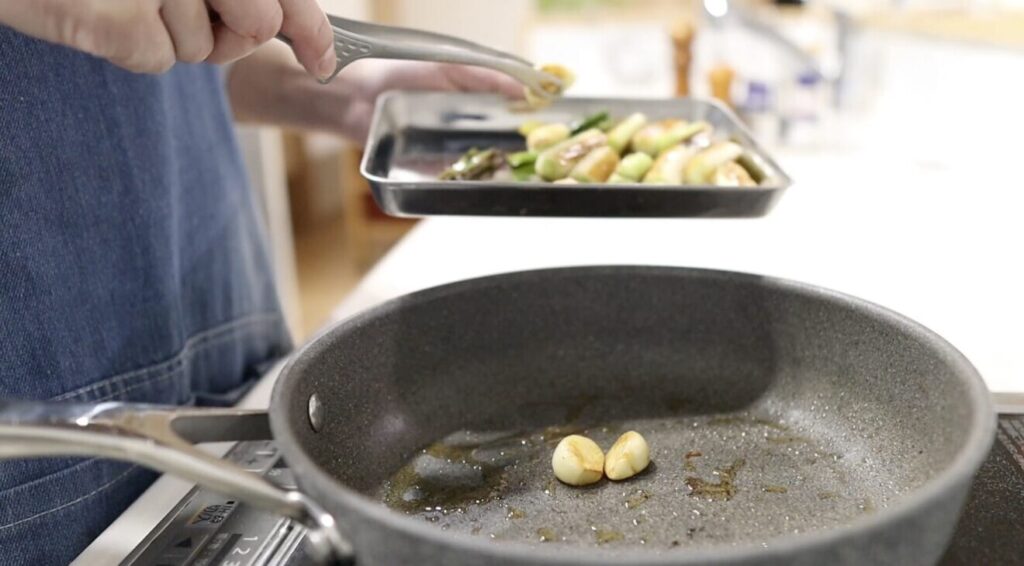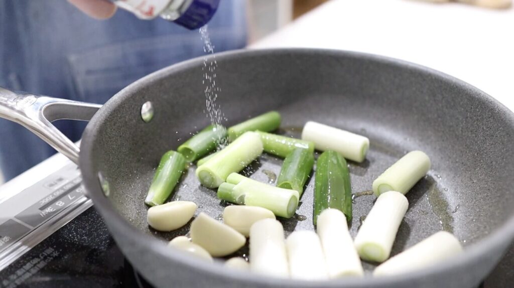 ⑤フライパンにごま油を敷き、ぶつ切りにした長ネギ、皮を剥いたニンニクを入れ塩(分量外)を少々振ります