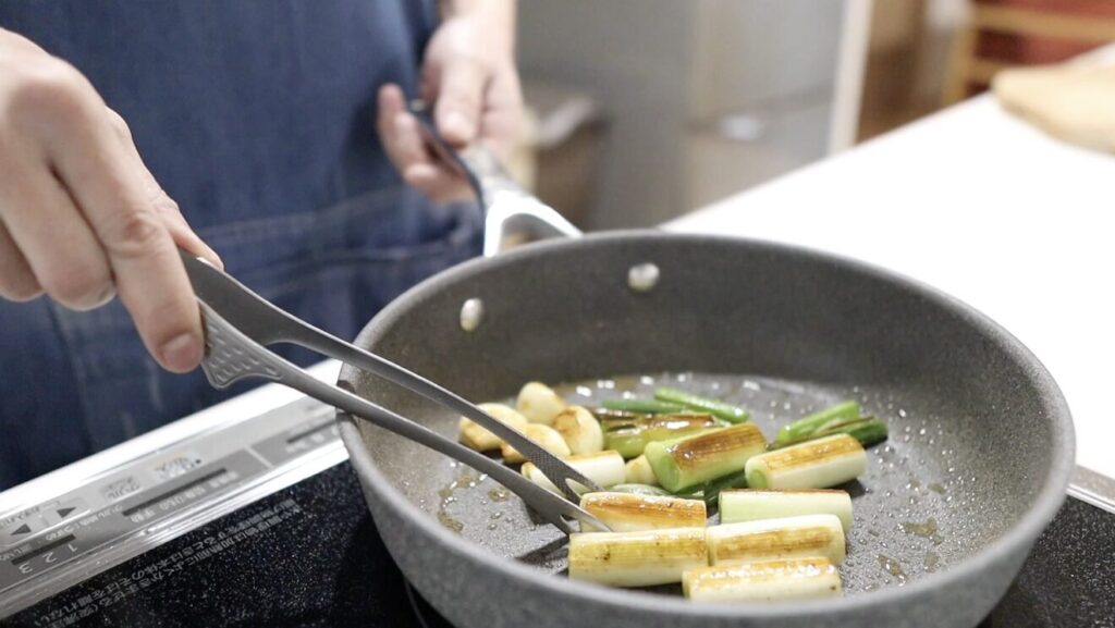 ⑥中火にし長ネギ、ニンニクに焼き色が付いたら一旦取り出します