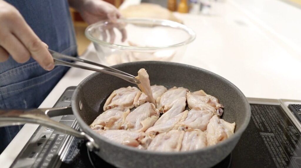 ⑦フライパンに手羽先を皮目から入れます