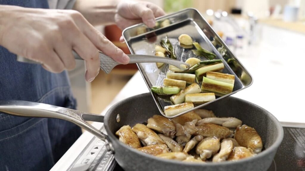 中火にし焼き色が付いたらひっくり返し両面に焼き色が付いたら、長ネギ、ニンニクを戻し入れます