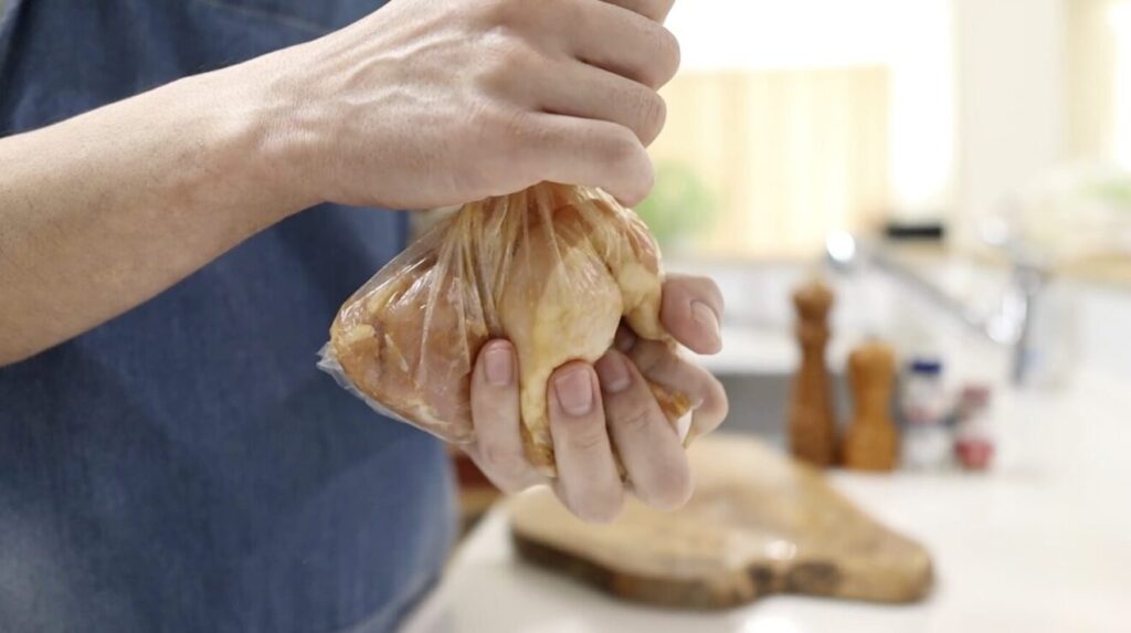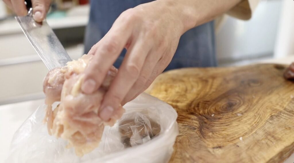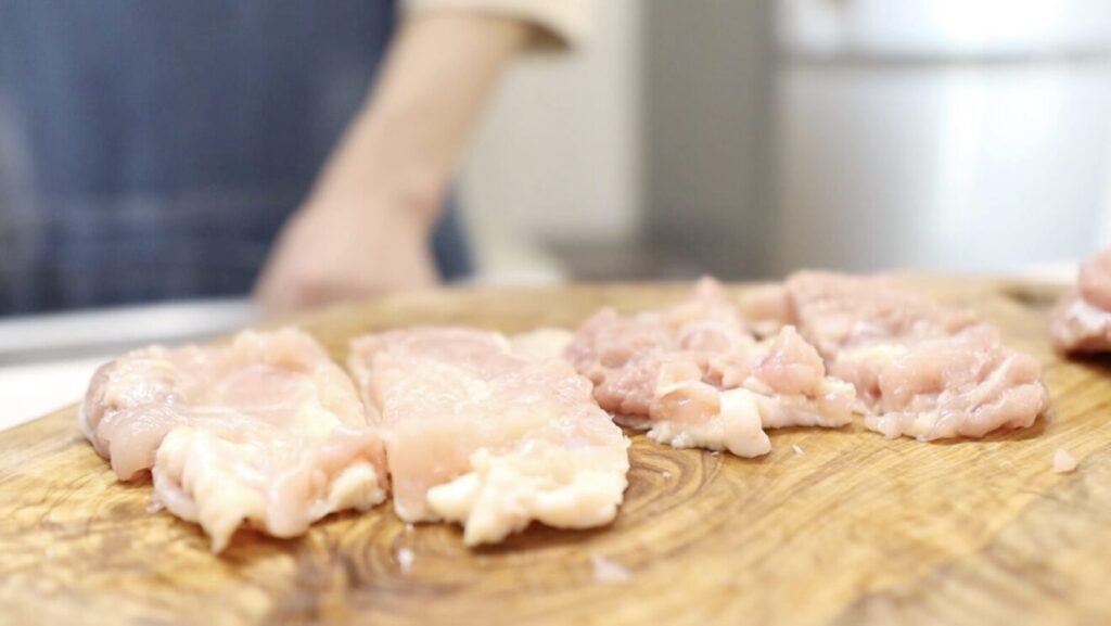 ⚪︎鶏もも肉は厚さが均一ではないので、盛り上がっているところに切れ目を入れ、火を通りやすくし失敗を防ぎます