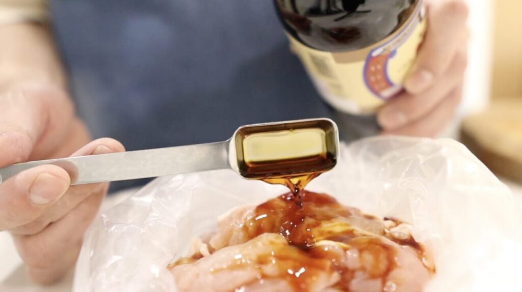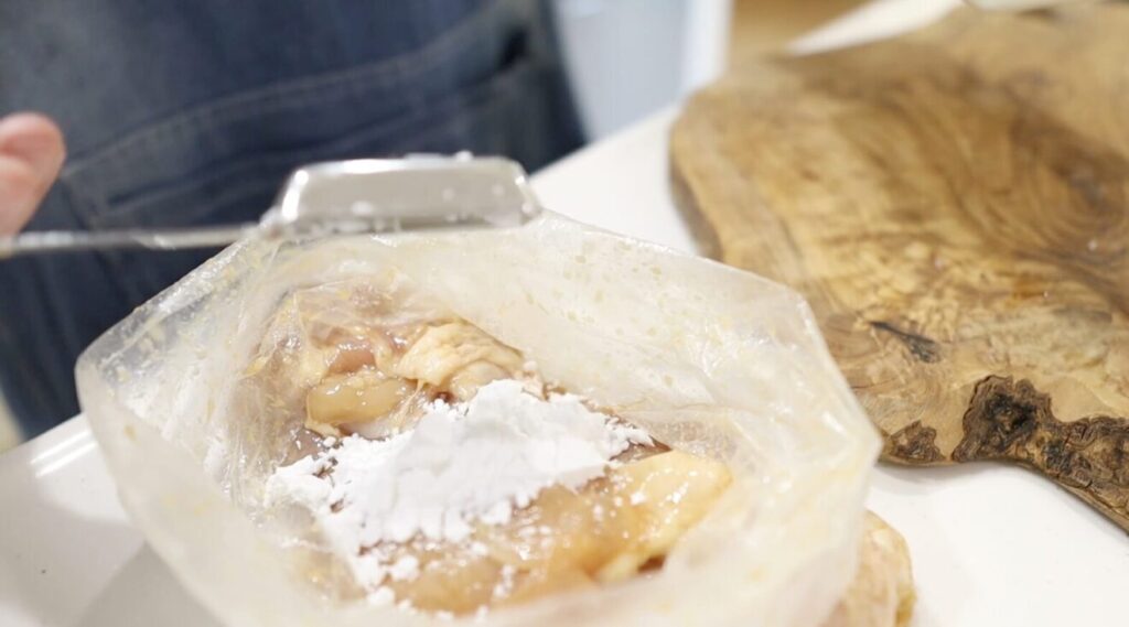 ③お肉に調味料が染み込んだら片栗粉を入れ混ぜ合わせます