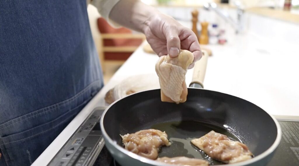 ④フライパンにごま油を入れ鶏肉の皮目を下にして並べ中火にかけ、キツネ色になったら取り出します